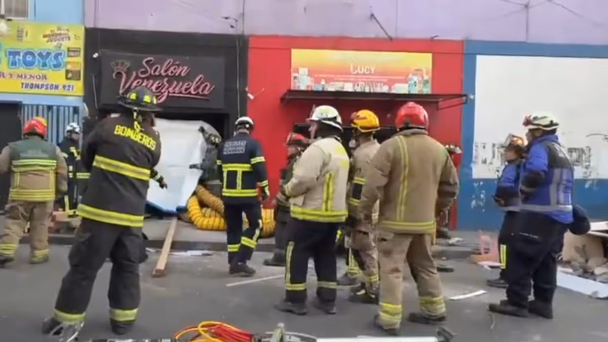 Equipos de emergencia remueven escombros tras colapso en local comercial del centro de la ciudad.